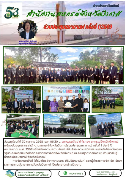 วันที่ 30 ตุลาคม 2568 เวลา 06.30 น. นางพรสถิตย์ กำไรทอง สหกรณ์จังหวัดบึงกาฬ พร้อมด้วยบุคลากรสำนักงานสหกรณ์จังหวัดบึงกาฬ ร่วมประชุมสภากาแฟ ครั้งที่ 1 ประจำปีงบปรมาณ พ.ศ. 2569 เพื่อสร้างความความสัมพันธ์อันดีและความสมัครสมานสามัคคีระหว่างภาครัฐและภาคเอกชน จัดโดยกระทรวงการคลังจังหวัดบึงกาฬ ณ ด่านศุลกากรบึงกาฬ ตำบลวิศิษฐ์ อำเภอเมืองบึงกาฬ จังหวัดบึงกาฬ