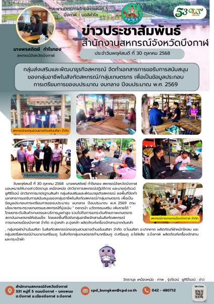 วันพฤหัสบดี ที่ 30 ตุลาคม 2568 นางพรสถิตย์ กำไรทอง สหกรณ์จังหวัดบึงกาฬ มอบหมายให้นางสาวจิตรานุช เหมืองหม้อ นักวิชาการสหกรณ์ปฏิบัติการ และนายรุ่งโรจน์ ชูศิริโรจน์ นักวิชาการมาตรฐานสินค้า กลุ่มส่งเสริมและพัฒนาธุรกิจสหกรณ์ ลงพื้นที่จัดทำเอกสารการขอรับการสนับสนุนของกลุ่มอาชีพในสังกัดสหกรณ์/กลุ่มเกษตรกร เพื่อเป็นข้อมูลประกอบการเตรียมการของบประมาณ งบกลาง ปีงบประมาณ พ.ศ. 2569 ตามนโยบายกระทรวงเกษตรและสหกรณ์ที่มุ่งเน้น " ตลาดนำ นวัตกรรมเสริม เพิ่มรายได้ " โดยยกระดับสินค้าเกษตรและบริการมูลค่าสูง รวมไปถึงการยกระดับศักยภาพเกษตรกร สถาบันเกษตรกรให้เข้มแข็ง โดยลงพื้นที่ไปยังกลุ่มอาชีพจักสานในสังกัดสหกรณ์การเกษตรเมืองบึงกาฬ จำกัด ต.บุ่งคล้า อ.บุ่งคล้า ผลิตภัณฑ์เครื่องจักสานจากคล้า , กลุ่มทอผ้าบ้านโนนศิลา ในสังกัดสหกรณ์กองทุนสวนยางตำบลโนนศิลา จำกัด ต.โนนศิลา อ.ปากคาด ผลิตภัณฑ์ผ้าหมักโคลน และกลุ่มสตรีสหกรณ์บ้านนาขามศรีชมภู ในสังกัดกลุ่มเกษตรกรทำนาศรีชมภู ต.ศรีชมภู อ.โซ่พิสัย จ.บึงกาฬ ผลิตภัณฑ์เครื่องจักสานและกระเป๋าผ้า