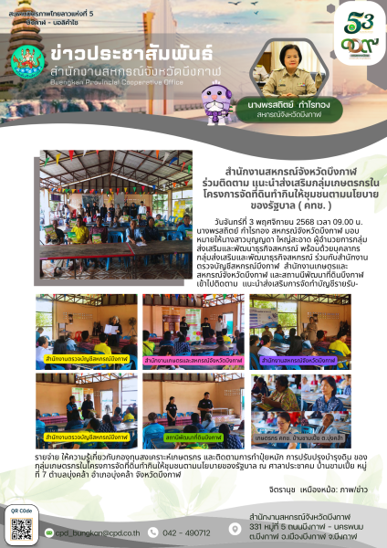 วันจันทร์ที่ 3 พฤศจิกายน 2568 เวลา 09.00 น. นางพรสถิตย์ กำไรทอง สหกรณ์จังหวัดบึงกาฬ มอบหมายให้นางสาวบุญญดา ใหญ่สะอาด ผู้อำนวยการกลุ่มส่งเสริมและพัฒนาธุรกิจสหกรณ์ พร้อมด้วยบุคลากรกลุ่มส่งเสริมและพัฒนาธุรกิจสหกรณ์ ร่วมกับสำนักงานตรวจบัญชีสหกรณ์บึงกาฬ สำนักงานเกษตรและสหกรณ์จังหวัดบึงกาฬ และสถานนีพัฒนาที่ดินบึงกาฬ เข้าไปติดตาม แนะนำส่งเสริมการจัดทำบัญชีรายรับ-รายจ่าย ให้ความรู้เกี่ยวกับกองทุนสงเคราะห์เกษตรกร และติดตามการทำปุ๋ยหมัก การปรับปรุงบำรุงดิน ของกลุ่มเกษตรกรในโครงการจัดที่ดินทำกินให้ชุมชนตามนโยบายของรัฐบาล ณ ศาลาประชาคม บ้านขามเปี้ย หมู่ที่ 7 ตำบลบุ่งคล้า อำเภอบุ่งคล้า จังหวัดบึงกาฬ