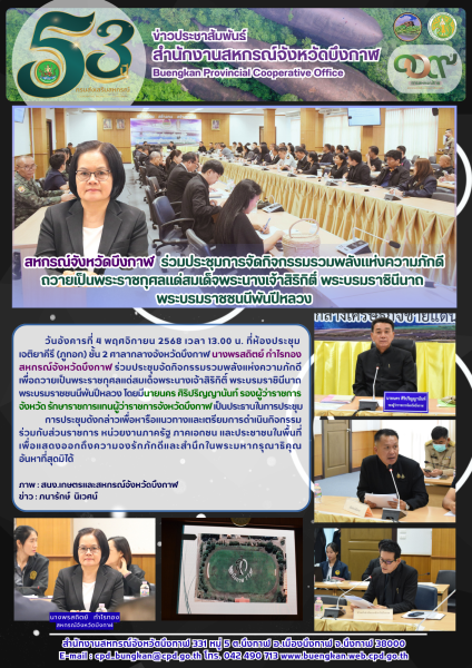 วันอังคารที่ 4 พฤศจิกายน 2568 เวลา 13.00 น. ที่ห้องประชุมเจติยาคีรี (ภูทอก) ชั้น 2 ศาลากลางจังหวัดบึงกาฬ นางพรสถิตย์ กำไรทอง สหกรณ์จังหวัดบึงกาฬ ร่วมประชุมจัดกิจกรรมรวมพลังแห่งความภักดี เพื่อถวายเป็นพระราชกุศลแด่สมเด็จพระนางเจ้าสิริกิติ์ พระบรมราชินีนาถ พระบรมราชชนนีพันปีหลวง โดยมีนายนคร ศิริปริญญานันท์ รองผู้ว่าราชการจังหวัด รักษาราชการแทนผู้ว่าราชการจังหวัดบึงกาฬ เป็นประธานในการประชุม