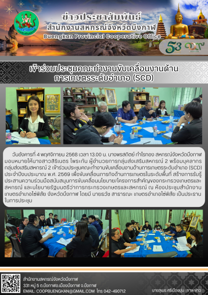 วันอังคารที่ 4 พฤศจิกายน 2568 เวลา 13.00 น. นางพรสถิตย์ กำไรทอง สหกรณ์จังหวัดบึงกาฬ มอบหมายให้นางสาวสิริเนตร โพระกัน ผู้อำนวยการกลุ่มส่งเสริมสหกรณ์ 2 พร้อมบุคลากรกลุ่มส่งเสริมสหกรณ์ 2 เข้าร่วมประชุมคณะทำงานขับเคลื่อนงานด้านการเกษตรระดับอำเภอ (SCD) ประจำปีงบประมาณ พ.ศ. 2569 เพื่อขับเคลื่อนภารกิจด้านการเกษตรในระดับพื้นที่ สร้างการรับรู้ ประสานความร่วมมือสนับสนุนการขับเคลื่อนนโยบาย/โครงการสำคัญของกระทรวงเกษตรและสหกรณ์ และนโยบายรัฐมนตรีว่าการกระทรวงเกษตรและสหกรณ์ ณ ห้องประชุมสำนักงานเกษตรอำเภอโซ่พิสัย จังหวัดบึงกาฬ โดยมี นายธวัช สาธารณะ เกษตรอำเภอโซ่พิสัย เป็นประธานในการประชุม