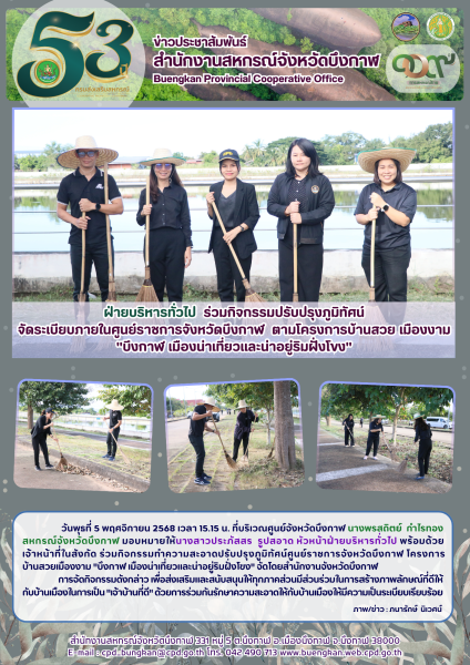 วันพุธที่ 5 พฤศจิกายน 2568 เวลา 15.15 น. ที่บริเวณศูนย์จังหวัดบึงกาฬ นางพรสถิตย์ กำไรทอง สหกรณ์จังหวัดบึงกาฬ มอบหมายให้นางสาวประภัสสร รูปสอาด หัวหน้าฝ่ายบริหารทั่วไป พร้อมด้วยเจ้าหน้าที่ในสังกัด ร่วมกิจกรรมทำความสะอาดปรับปรุงภูมิทัศน์ศูนย์ราชการจังหวัดบึงกาฬ โครงการบ้านสวยเมืองงาม "บึงกาฬ เมืองน่าเที่ยวและน่าอยู่ริมฝั่งโขง" จัดโดยสำนักงานจังหวัดบึงกาฬ