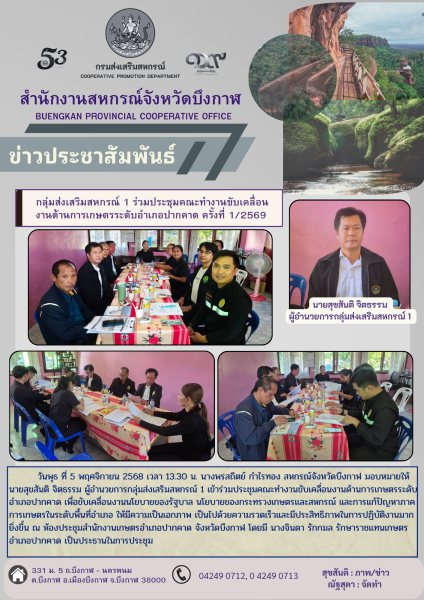 วันพุธ ที่ 5 พฤศจิกายน 2568 เวลา 13.30 น. นางพรสถิตย์ กำไรทอง สหกรณ์จังหวัดบึงกาฬ มอบหมายให้นายสุขสันติ จิตธรรม ผู้อำนวยการกลุ่มส่งเสริมสหกรณ์ 1 เข้าร่วมประชุมคณะทำงานขับเคลื่อนงานด้านการเกษตรระดับอำเภอปากคาด เพื่อขับเคลื่อนงานนโยบายของรัฐบาล นโยบายของกระทรวงเกษตรและสหกรณ์ และการแก้ปัญหาภาคการเกษตรในระดับพื้นที่อำเภอ ให้มีความเป็นเอกภาพเป็นไปด้วยความรวดเร็วและมีประสิทธิภาพในการปฏิบัติงานมากยิ่งขึ้น ณ ห้องประชุมสำนักงานเกษตรอำเภอปากคาด จังหวัดบึงกาฬ โดยมี นางจินดา รักกมล รักษาราชแทนเกษตรอำเภอปากคาด เป็นประธานในการประชุม