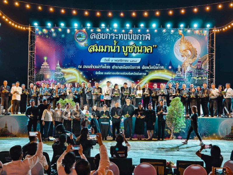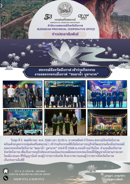วันพุธ ที่ 5 พฤศจิกายน พ.ศ. 2568 เวลา 20.00 น. นางพรสถิตย์ กำไรทอง สหกรณ์จังหวัดบึงกาฬ พร้อมด้วยบุคลากรกลุ่มส่งเสริมสหกรณ์ 1 เข้าร่วมกิจกรรมพิธีเปิดโครงการอนุรักษ์วัฒนธรรมท้องถิ่นประเพณีลอยกระทงจังหวัดบึงกาฬ “สมมาน้ำ บูชานาค” ประจำปี 2568 ณ ถนนข้าวเม่าริมโขง อำเภอเมืองบึงกาฬ จังหวัดบึงกาฬ เพื่อเป็นการอนุรักษ์ขนบธรรมเนียมประเพณีลอยกระทงของไทยมิให้สูญหายไปตามกาลเวลา โดยมีนายนคร ศิริปัญญานันท์ รองผู้ว่าราชการจังหวัด รักษาราชการแทนผู้ว่าราชการจังหวัดบึงกาฬ เป็นประธานในพิธี