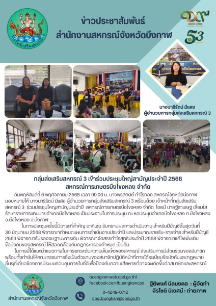 วันพฤหัสบดีที่ 6 พฤศจิกายน 2568 เวลา 09.00 น. นางพรสถิตย์ กำไรทอง สหกรณ์จังหวัดบึงกาฬ มอบหมายให้ นางนารีรัตน์ มีแสง ผู้อำนวยการกลุ่มส่งเสริมสหกรณ์ 3 พร้อมด้วย เจ้าหน้าที่กลุ่มส่งเสริมสหกรณ์ 3 ร่วมประชุมใหญสามัญประจำปี สหกรณ์การเกษตรบึงโขงหลง จำกัด โดยมี นายฐิราเชษฐ เลื่อมใส รักษาราชการแทนนายอำเภอบึงโขงหลง เป็นประธานในการประชุม ณ หอประชุมอำเภอบึงโขงหลง ต.บึงโขงหลง อ.บึงโขงหลง จ.บึงกาฬ