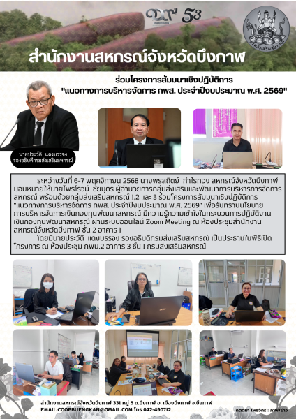 ระหว่างวันที่ 6-7 พฤศจิกายน 2568 นางพรสถิตย์ กำไรทอง สหกรณ์จังหวัดบึงกาฬ มอบหมายให้นายไพรโรจน์ ชัยบุตร ผู้อำนวยการกลุ่มส่งเสริมและพัฒนาการบริหารการจัดการสหกรณ์ พร้อมด้วยกลุ่มส่งเสริมสหกรณ์ 1,2 และ 3 ร่วมโครงการสัมมนาเชิงปฏิบัติการ "แนวทางการบริหารจัดการ กพส. ประจำปีงบประมาณ พ.ศ. 2569" เพื่อรับทราบนโยบายการบริหารจัดการเงินกองทุนพัฒนาสหกรณ์ มีความรู้ความเข้าใจในกระบวนการปฏิบัติงานเงินกองทุนพัฒนาสหกรณ์ ผ่านระบบออนไลน์ Zoom Meeting ณ ห้องประชุมสำนักงานสหกรณ์จังหวัดบึงกาฬ ชั้น 2 อาคาร 1 โดยมีนายประวัติ แดงบรรจง รองอธิบดีกรมส่งเสริมสหกรณ์ เป็นประธานในพิธีโครงการ ณ ห้องประชุม กพน.2 อาคาร 3 ชั้น 1 กรมส่งเสริมสหกรณ์