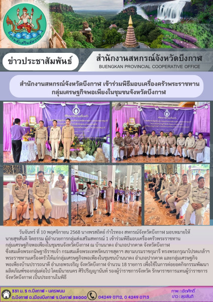วันจันทร์ ที่ 10 พฤศจิกายน 2568 นางพรสถิตย์ กำไรทอง สหกรณ์จังหวัดบึงกาฬ มอบหมายให้ นายสุขสันติ จิตธรรม ผู้อำนวยการกลุ่มส่งเสริมสหกรณ์ 1 เข้าร่วมพิธีมอบเครื่องครัวพระราชทานกลุ่มเศรษฐกิจพอเพียงในชุมชนจังหวัดบึงกาฬ ณ บ้านนาดง อำเภอปากคาด จังหวัดบึงกาฬ ซึ่งสมเด็จพระกนิษฐาธิราชเจ้า กรมสมเด็จพระเทพรัตนราชสุดาฯ สยามบรมราชกุมารี ทรงพระกรุณาโปรดเกล้าฯ พระราชทานเครื่องครัวให้แก่กลุ่มเศรษฐกิจพอเพียงในชุมชนบ้านนาดง อำเภอปากคาด และกลุ่มเศรษฐกิจพอเพียงบ้านปรารถนาดี อำเภอพรเจริญ จังหวัดบึงกาฬ จำนวน 18 รายการ เพื่อใช้ในการต่อยอดกิจกรรมพัฒนาผลิตภัณฑ์ของกลุ่มต่อไป โดยมีนายนคร ศิริปริญญานันท์ รองผู้ว่าราชการจังหวัด รักษาราชการแทนผู้ว่าราชการจังหวัดบึงกาฬ เป็นประธานในพิธี