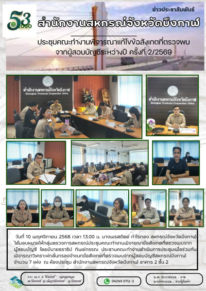 วันที่ 10 พฤศจิกายน 2568 เวลา 13.00 น. นางพรสถิตย์ กำไรทอง สหกรณ์จังหวัดบึงกาฬ ได้มอบหมายให้กลุ่มตรวจการสหกรณ์ ประชุมคณะทำงานพิจารณาข้อสังเกตที่ตรวจพบจากผู้สอบบัญชี โดยมีนายธราธิป ทิพย์กรรณ ประธานคณะทำงาน ดำเนินการประชุม เพื่อร่วมกันพิจารณาวิเคราะห์กลั่นกรองจำแนกข้อสังเกตที่ตรวจพบจากผู้สอบบัญชีสหกรณ์บึงกาฬ จำนวน 7 แห่ง ณ ห้องประชุม สำนักงานสหกรณ์จังหวัดบึงกาฬ อาคาร 2 ชั้น 2