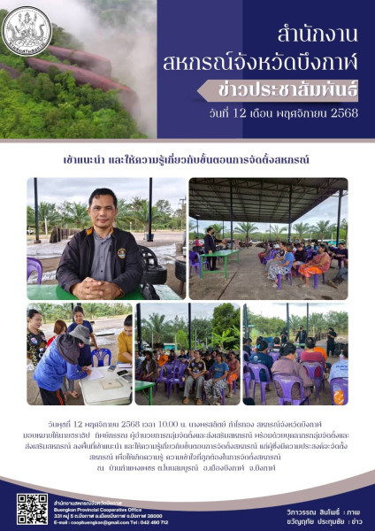 วันพุธที่ 12 พฤศจิกายน 2568 เวลา 10.00 น. นางพรสถิตย์ กำไรทอง สหกรณ์จังหวัดบึงกาฬ มอบหมายให้นายธราธิป ทิพย์กรรณ ผู้อำนวยการกลุ่มจัดตั้งและส่งเสริมสหกรณ์ พร้อมด้วยบุคลากรกลุ่มจัดตั้งและส่งเสริมสหกรณ์ ลงพื้นที่เข้าแนะนำ และให้ความรู้เกี่ยวกับขั้นตอนการจัดตั้งสหกรณ์ แก่ผู้ซึ่งมีความประสงค์จะจัดตั้้งสหกรณ์ เพื่อให้เกิดความรู้ ความเข้าใจที่ถูกต้องในการจัดตั้งสหกรณ์ ณ บ้านกำแพงเพชร ต.โนนสมบูรณ์ อ.เมืองบึงกาฬ จ.บึงกาฬ