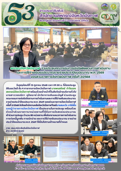 วันพฤหัสบดีที่ 13 ตุลาคม 2568 เวลา 09.00 น. ที่ห้องประชุมสิรินธรวัลลี ชั้น 4 ศาลากลางจังหวัดบึงกาฬ นางพรสถิตย์ กำไรทอง สหกรณ์จังหวัดบึงกาฬ พร้อมด้วยเจ้าหน้าที่ในสังกัดฝ่ายบริหารทั่วไป นางสาววรรณิภา อุปัชฌาย์ นักวิชาการเงินและบัญชี ร่วมประชุมคณะกรรมการเร่งรัดติดตามการดำเนินงานและการใช้จ่ายเงินงบประมาณรายจ่ายประจำปีงบประมาณ พ.ศ. 2569 ของส่วนราชการจังหวัดบึงกาฬ ครั้งที่ 2/2568 จัดโดยสำนักงานคลังจังหวัดบึงกาฬ โดยมีนายสมหวัง อารีย์เอื้อ รองผู้ว่าราชการจังหวัดบึงกาฬ เป็นประธานในการประชุม พร้อมด้วย หัวหน้าส่วนราชการ/หน่วยงานที่ได้รับการจัดสรรงบประมาณเข้าร่วมการประชุม จำนวน 80 หน่วยงาน เพื่อรับทราบแนวทางการดำเนินงานการก่อหนี้ผูกพัน การเบิกจ่าย และการใช้จ่ายเงินงบประมาณ รายจ่ายประจำปีงบประมาณ พ.ศ. 2569 ให้เป็นไปตามเป้าหมายที่กำหนด