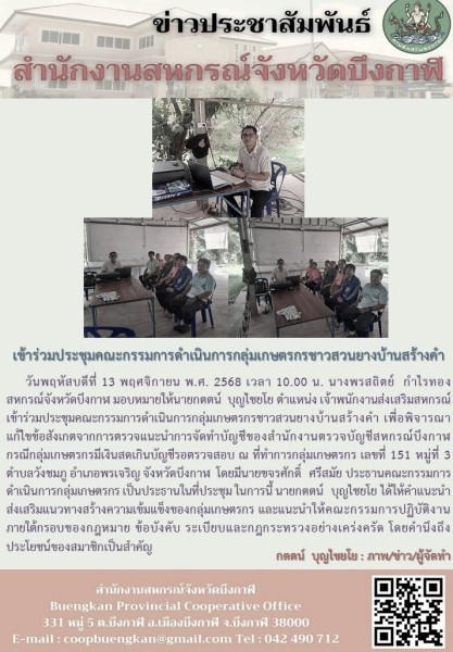 วันพฤหัสบดีที่ 13 พฤศจิกายน พ.ศ. 2568 เวลา 10.00 น. นางพรสถิตย์ กำไรทอง สหกรณ์จังหวัดบึงกาฬ มอบหมายให้นายกตตน์ บุญไชยโย ตำแหน่ง เจ้าพนักงานส่งเสริมสหกรณ์ เข้าร่วมประชุมคณะกรรมการดำเนินการกลุ่มเกษตรกรชาวสวนยางบ้านสร้างคำ เพื่อพิจารณาแก้ไขข้อสังเกตจากการตรวจแนะนำการจัดทำบัญชีของสำนักงานตรวจบัญชีสหกรณ์บึงกาฬ กรณีกลุ่มเกษตรกรมีเงินสดเกินบัญชีรอตรวจสอบ ณ ที่ทำการกลุ่มเกษตรกร เลขที่ 151 หมู่ที่ 3 ตำบลวังชมภู อำเภอพรเจริญ จังหวัดบึงกาฬ โดยมีนายขจรศักดิ์ ศรีสมัย ประธานคณะกรรมการดำเนินการกลุ่มเกษตรกร เป็นประธานในที่ประชุม