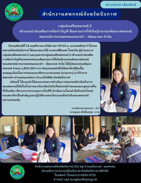 วันพฤหัสบดีที่ 13 พฤศจิกายน 2568 เวลา 09.00 น. นางพรสถิตย์ กำไรทอง สหกรณ์จังหวัดบึงกาฬ ได้มอบหมายให้ นางสาวสิริเนตร โพระกัน ผู้อำนวยการกลุ่มส่งเสริมสหกรณ์ 2 และบุคลากรกลุ่มส่งเสริมสหกรณ์ 2 เข้าแนะนำส่งเสริมการจัดทำบัญชีของสหกรณ์และติดตามการใช้เงินกู้กองทุนพัฒนาสหกรณ์ ของสหกรณ์การเกษตรหนองนาคำ - พัฒนาพร จำกัด ได้กู้เงินกองทุนพัฒนาสหกรณ์ จำนวน 1,800,000 บาท วัตถุประสงค์เพื่อให้สมาชิกกู้ยืมเป็นทุนหมุนเวียนในการประกอบอาชีพทางการเกษตร (ยางพารา) ณ ที่ทำการสหกรณ์ฯ ตำบลหนองพันทา อำเภอโซ่พิสัย จังหวัดบึงกาฬ