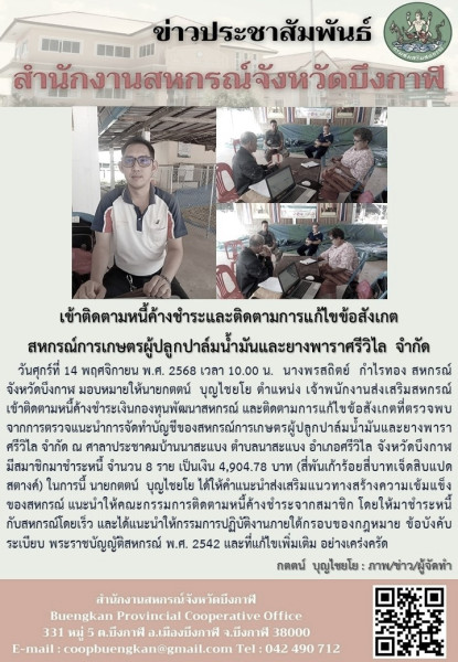 วันศุกร์ที่ 14 พฤศจิกายน พ.ศ. 2568 เวลา 10.00 น. นางพรสถิตย์ กำไรทอง สหกรณ์จังหวัดบึงกาฬ มอบหมายให้นายกตตน์ บุญไชยโย ตำแหน่ง เจ้าพนักงานส่งเสริมสหกรณ์ เข้าติดตามหนี้ค้างชำระเงินกองทุนพัฒนาสหกรณ์ และติดตามการแก้ไขข้อสังเกตที่ตรวจพบจากการตรวจแนะนำการจัดทำบัญชีของสหกรณ์การเกษตรผู้ปลูกปาล์มน้ำมันและยางพาราศรีวิไล จำกัด ณ ศาลาประชาคมบ้านนาสะแบง ตำบลนาสะแบง อำเภอศรีวิไล จังหวัดบึงกาฬ มีสมาชิกมาชำระหนี้ จำนวน 8 ราย เป็นเงิน 4,904.78 บาท (สี่พันเก้าร้อยสี่บาทเจ็ดสิบแปดสตางค์) ในการนี้ นายกตตน์ บุญไชยโย ได้ให้คำแนะนำส่งเสริมแนวทางสร้างความเข้มแข็งของสหกรณ์ แนะนำให้คณะกรรมการติดตามหนี้ค้างชำระจากสมาชิก โดยให้มาชำระหนี้กับสหกรณ์โดยเร็ว และได้แนะนำให้กรรมการปฏิบัติงานภายใต้กรอบของกฎหมาย ข้อบังคับ ระเบียบ พระราชบัญญัติสหกรณ์ พ.ศ. 2542 และที่แก้ไขเพิ่มเติม อย่างเคร่งครัด