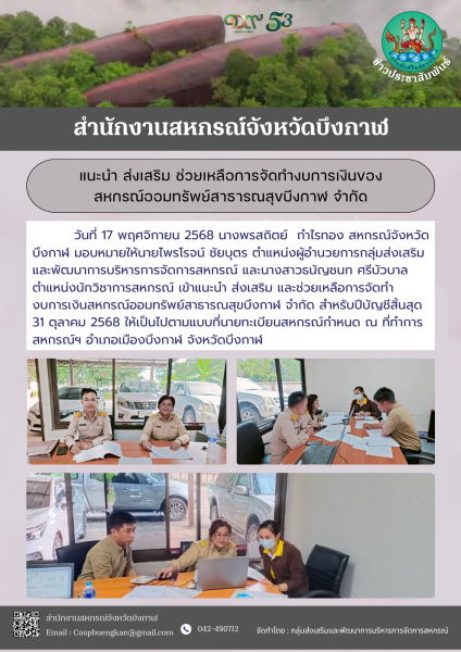 วันที่ 17 พฤศจิกายน 2568 นางพรสถิตย์ กำไรทอง สหกรณ์จังหวัดบึงกาฬ มอบหมายให้ นายไพรโรจน์ ชัยบุตร ตำแหน่งผู้อำนวยการกลุ่มส่งเสริมและพัฒนาการบริหารการจัดการสหกรณ์ และนางสาวธนัญชนก ศรีบัวบาล ตำแหน่งนักวิชาการสหกรณ์ เข้าแนะนำ ส่งเสริม และช่วยเหลือการจัดทำงบการเงินของสหกรณ์ออมทรัพย์สาธารณสุขบึงกาฬ จำกัด สำหรับปีบัญชีสิ้นสุด 31 ตุลาคม 2568 ให้เป็นไปตามแบบที่นายทะเบียนสหกรณ์กำหนด ณ ที่ทำการสหกรณ์ฯ อำเภอเมืองบึงกาฬ จังหวัดบึงกาฬ