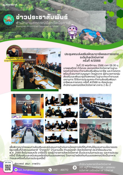 วันที่ 20 พฤศจิกายน 2568 เวลา 09.30 น. นางพรสถิตย์ กำไรทอง สหกรณ์จังหวัดบึงกาฬ ในฐานะรองหัวหน้าคณะทำงานส่งเสริมพัฒนาอาชีพ และการตลาด พร้อมด้วยนางสาวบุญญดา ใหญ่สะอาด ผู้อำนวยการกลุ่มส่งเสริมและพัฒนาธุรกิจสหกรณ์ ในฐานะคณะทำงานและเลขานุการ ได้จัดการประชุมคณะทำงานส่งเสริมพัฒนาอาชีพและการตลาด ครั้งที่ 4/2568 ณ ห้องประชุมสำนักงานสหกรณ์จังหวัดบึงกาฬ อาคาร 2 ชั้น 2 เพื่อพิจารณาร่างแผนการส่งเสริมและสนับสนุนการดำเนินงานโครงการจัดที่ดินทำกินให้ชุมชนตามนโยบายของรัฐบาลพื้นที่ป่าสงวนแห่งชาติ "ป่าดงภูวัว" บ้านขามเปี้ย ตำบลบุ่งคล้า จังหวัดบึงกาฬ ประจำปีงบประมาณ พ.ศ. 2569 ซึ่งมีนายสมหวัง อารีย์เอื้อ รองผู้ว่าราชการจังหวัดบึงกาฬ เป็นประธานในการประชุม และการประชุมครั้งนี้ ได้ส่งเสริมและสนับสนุนผลิตภัณฑ์นมของสหกรณ์ โดยการนำผลิตภัณฑ์นมของสหกรณ์จัดเป็นอาหารว่างและเครื่องดื่มในการประชุมครั้งนี้