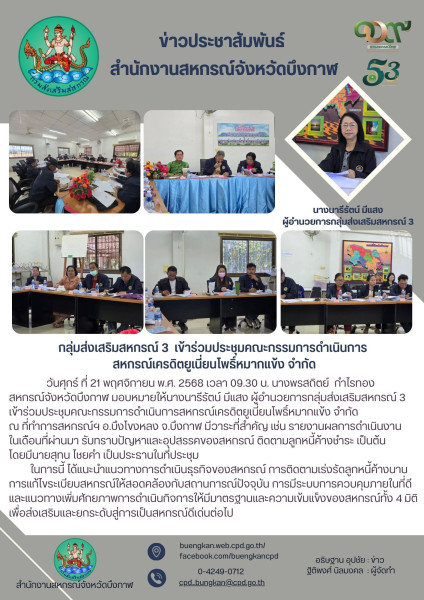 วันศุกร์ ที่ 21 พฤศจิกายน พ.ศ. 2568 เวลา 09.30 น. นางพรสถิตย์ กำไรทอง สหกรณ์จังหวัดบึงกาฬ มอบหมายให้นางนารีรัตน์ มีแสง ผู้อำนวยการกลุ่มส่งเสริมสหกรณ์ 3 เข้าร่วมประชุมคณะกรรมการดำเนินการสหกรณ์เครดิตยูเนี่ยนโพธิ์หมากแข้ง จำกัด ณ ที่ทำการสหกรณ์ฯ อ.บึงโขงหลง จ.บึงกาฬ มีวาระที่สำคัญ เช่น รายงานผลการดำเนินงานในเดือนที่ผ่านมา รับทราบปัญหาและอุปสรรคของสหกรณ์ ติดตามลูกหนี้ค้างชำระ เป็นต้น โดยมีนายสุทน ไชยคำ เป็นประธานในที่ประชุม