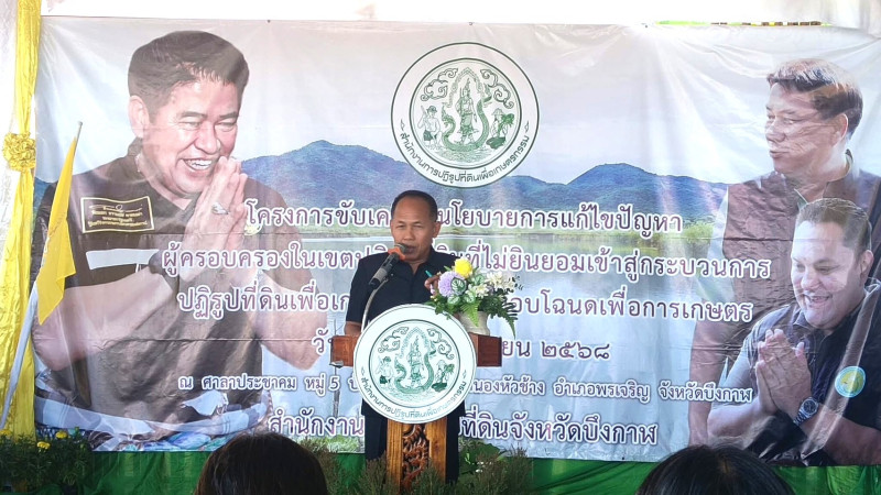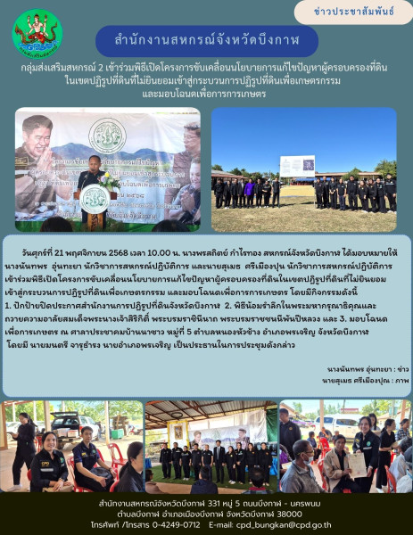 วันศุกร์ที่ 21 พฤศจิกายน 2568 เวลา 10.00 น. นางพรสถิตย์ กำไรทอง สหกรณ์จังหวัดบึงกาฬ ได้มอบหมายให้ นางนันทพร อุ่นทะยา นักวิชาการสหกรณ์ปฏิบัติการ และนายสุเมธ ศรีเมืองปุน นักวิชาการสหกรณ์ปฏิบัติการ เข้าร่วมพิธีเปิดโครงการขับเคลื่อนนโยบายการแก้ไขปัญหาผู้ครอบครองที่ดินในเขตปฏิรูปที่ดินที่ไม่ยินยอมเข้าสู่กระบวนการปฏิรูปที่ดินเพื่อเกษตรกรรม และมอบโฉนดเพื่อการการเกษตร ณ ศาลาประชาคมบ้านนาซาว หมู่ที่ 5 ตำบลหนองหัวช้าง อำเภอพรเจริญ จังหวัดบึงกาฬ โดยมี นายมนตรี จารุธำรง นายอำเภอพรเจริญ เป็นประธานในการประชุมดังกล่าว โดยมีกิจกรรมดังนี้