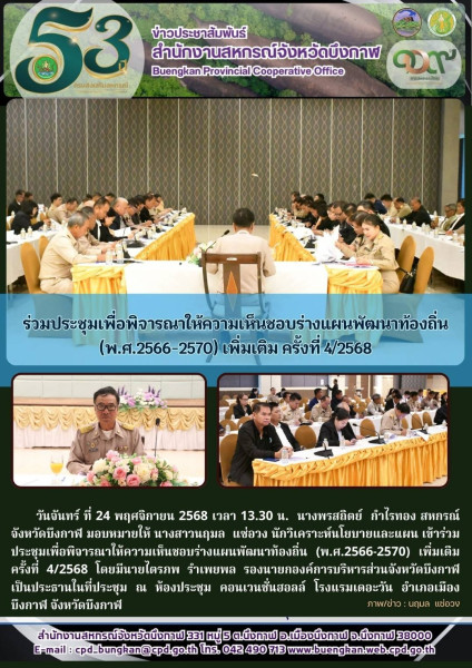 วันจันทร์ ที่ 24 พฤศจิกายน 2568 เวลา 13.30 น. นางพรสถิตย์ กำไรทอง สหกรณ์จังหวัดบึงกาฬ มอบหมายให้ นางสาวนฤมล แซ่อวง นักวิเคราะห์นโยบายและแผน เข้าร่วมประชุมเพื่อพิจารณาให้ความเห็นชอบร่างแผนพัฒนาท้องถิ่น (พ.ศ.2566-2570) เพิ่มเติม ครั้งที่ 4/2568 โดยมีนายไตรภพ รำเพยพล รองนายกองค์การบริหารส่วนจังหวัดบึงกาฬเป็นประธานในที่ประชุม ณ ห้องประชุม คอนเวนชั่นฮอลล์ โรงแรมเดอะวัน อำเภอเมืองบึงกาฬ จังหวัดบึงกาฬ