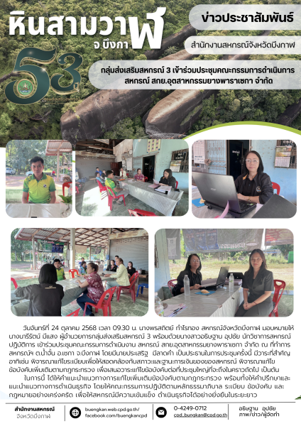 วันจันทร์ที่ 24 ตุลาคม 2568 เวลา 09.30 น. นางพรสถิตย์ กำไรทอง สหกรณ์จังหวัดบึงกาฬ มอบหมายให้ นางนารีรัตน์ มีแสง ผู้อำนวยการกลุ่มส่งเสริมสหกรณ์ 3 พร้อมด้วยนางสาวอธิษฐาน อุปชัย นักวิชาการสหกรณ์ปฏิบัติการ เข้าร่วมประชุมคณะกรรมการดำเนินงาน สหกรณ์ สกย.อุตสาหกรรมยางพาราเซกา จำกัด ณ ที่ทำการสหกรณ์ฯ ต.น้ำจั้น อ.เซกา จ.บึงกาฬ โดยมีนายประเสริฐ มีลาดคำ เป็นประธานในการประชุมครั้งนี้ มีวาระที่สำคัญ อาทิเช่น พิจารณาแก้ไขระเบียบเพื่อให้สอดคล้องกับสภาวะและฐานะการเงินของของสหกรณ์ พิจารณาแก้ไขข้อบังคับเพิ่มเติมตามกฎกระทรวง เพื่อเสนอวาระแก้ไขข้อบังคับต่อที่ประชุมใหญ่ที่จะถึงในคราวถัดไป เป็นต้น