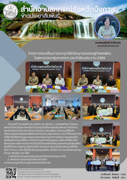 วันจันทร์ที่ 24 พฤศจิกายน 2568 เวลา 09.30 น. นางพรสถิตย์ กำไรทอง สหกรณ์จังหวัดบึงกาฬ พร้อมด้วยกลุ่มจัดตั้งและส่งเสริมสหกรณ์ สำนักงานสหกรณ์จังหวัดบึงกาฬ ดำเนินการโครงการขับเคลื่อนการประยุกต์ใช้หลักปรัชญาของเศรษฐกิจพอเพียงในสหกรณ์และกลุ่มเกษตรกร ประจำปีงบประมาณ 2569 เพื่อให้สหกรณ์และกลุ่มเกษตรกรน้อมนำแนวทางปรัชญาของเศรษฐกิจพอเพียงไปประยุกต์ใช้ในการดำเนินงานอย่างเป็นรูปธรรม พร้อมทั้งให้สมาชิกสหกรณ์และกลุ่มเกษตรมีการดำเนินชีวิตตามหลักปรัชญาของเศรษฐกิจพอเพียง โดยให้สำนักงานสหกรณ์จังหวัดบึงกาฬ วิเคราะห์และคัดเลือกสหกรณ์ที่ได้รับเลือก จำนวน 2 แห่ง ซึ่งได้รับเงินอุดหนุนแห่งละ 18,000 บาท รวมเป็นเงินอุดหนุน จำนวน 36,000 บาท ได้แก่ 1. สหกรณ์การเกษตรกองทุนสวนยางตำบลท่ากกแดง จำกัด 2. สหกรณ์การเกษตรเมืองบึงกาฬ จำกัด ณ ห้องประชุมสำนักงานสหกรณ์จังหวัดบึงกาฬ