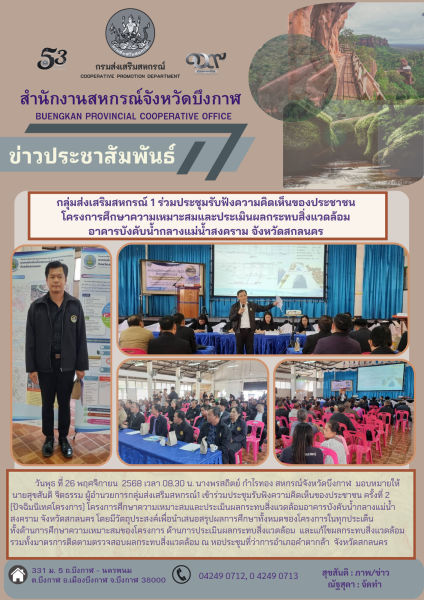 วันพุธ ที่ 26 พฤศจิกายน 2568 เวลา 08.30 น. นางพรสถิตย์ กำไรทอง สหกรณ์จังหวัดบึงกาฬ มอบหมายให้นายสุขสันติ จิตธรรม ผู้อำนวยการกลุ่มส่งเสริมสหกรณ์1 เข้าร่วมประชุมรับฟังความคิดเห็นของประชาชน ครั้งที่ 2 (ปัจฉิมนิเทศโครงการ) โครงการศึกษาความเหมาะสมและประเมินผลกระทบสิ่งแวดล้อมอาคารบังคับน้ำกลางแม่น้ำสงคราม จังหวัดสกลนคร โดยมีวัตถุประสงค์เพื่อนำเสนอสรุปผลการศึกษาทั้งหมดของโครงการในทุกประเด็น ทั้งด้านการศึกษาความเหมาะสมของโครงการ ด้านการประเมินผลกระทบสิ่งแวดล้อมและแก้ไขผลกระทบสิ่งแวดล้อม รวมทั้งมาตรการติดตามตรวจสอบผลกระทบสิ่งแวดล้อม ณ หอประชุมที่ว่าการอำเภอคำตากล้า จังหวัดสกลนคร