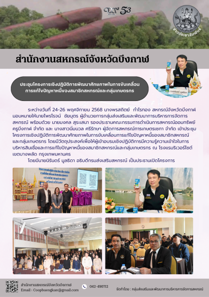 ระหว่างวันที่ 24-26 พฤศจิกายน 2568 นางพรสถิตย์ กำไรทอง สหกรณ์จังหวัดบึงกาฬ มอบหมายให้นายไพรโรจน์ ชัยบุตร ผู้อำนวยการกลุ่มส่งเสริมและพัฒนาการบริหารการจัดการสหกรณ์ พร้อมด้วย นายมงคล สุระเสนา รองประธานคณะกรรมการดำเนินการสหกรณ์ออมทรัพย์ครูบึงกาฬ จำกัด และ นางสาวนิ่มนวล ศรีรักษา ผู้จัดการสหกรณ์การเกษตรเซกา จำกัด เข้าประชุมโครงการเชิงปฏิบัติการพัฒนาศักยภาพในการขับเคลื่อนการแก้ไขปัญหาหนี้ของสมาชิกสหกรณ์และกลุ่มเกษตรกร โดยมีวัตถุประสงค์เพื่อให้ผู้เข้าอบรมเชิงปฏิบัติการมีความรู้ความเข้าใจในการบริหารสินเชื่อและการแก้ไขปัญหาหนี้ของสมาชิกสหกรณ์และกลุ่มเกษตรกร ณ โรงแรมริเวอร์ไซต์ เขตบางพลัด กรุงเทพมหานคร โดยมีนายนิรันดร์ มูลธิดา อธิบดีกรมส่งเสริมสหกรณ์ เป็นประธานเปิดโครงการ