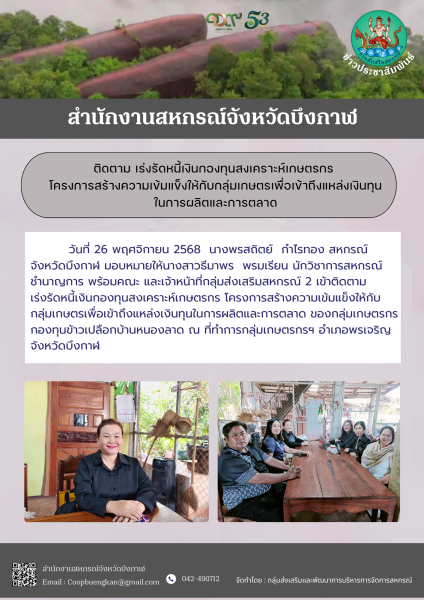วันที่ 26 พฤศจิกายน 2568 นางพรสถิตย์ กำไรทอง สหกรณ์จังหวัดบึงกาฬ มอบหมายให้นางสาวธีมาพร พรมเรียน นักวิชาการสหกรณ์ชำนาญการ พร้อมคณะ และเจ้าหน้าที่กลุ่มส่งเสริมสหกรณ์ 2 เข้าติดตาม เร่งรัดหนี้เงินกองทุนสงเคราะห์เกษตรกร โครงการสร้างความเข้มแข็งให้กับกลุ่มเกษตรเพื่อเข้าถึงแหล่งเงินทุนในการผลิตและการตลาด ของกลุ่มเกษตรกรกองทุนข้าวเปลือกบ้านหนองลาด ณ ที่ทำการกลุ่มเกษตรกรฯ อำเภอพรเจริญ จังหวัดบึงกาฬ