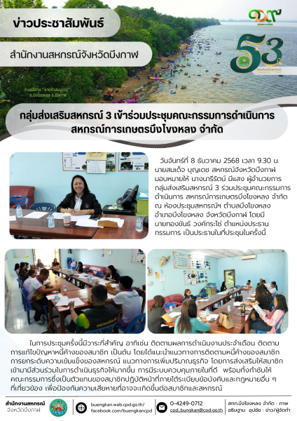 วันจันทร์ที่ 8 ธันวาคม 2568 เวลา 9.30 น. นายสมเด็จ บุญเดช สหกรณ์จังหวัดบึงกาฬ มอบหมายให้ นางนารีรัตน์ มีแสง ผู้อำนวยการ กลุ่มส่งเสริมสหกรณ์ 3 ร่วมประชุมคณะกรรมการดำเนินการ สหกรณ์การเกษตรบึงโขงหลง จำกัด ณ ห้องประชุมสหกรณ์ฯ ตำบลบึงโขงหลง อำเภอบึงโขงหลง จังหวัดบึงกาฬ โดยมีนายทองขันธ์ วงค์กระโซ่ ตำแหน่งประธานกรรมการ เป็นประธานในที่ประชุมในครั้งนี้