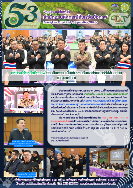 สหกรณ์จังหวัดบึงกาฬ ร่วมกิจกรรมเนื่องในงานวันต่อต้านคอร์รัปชันสากล (ประเทศไทย) ณ ห้องประชุมสิรินธรวัลลี ชั้น 4 ศาลากลางจังหวัดบึงกาฬ
