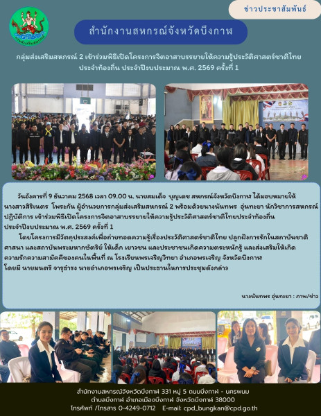 วันอังคารที่ 9 ธันวาคม 2568 เวลา 09.00 น. นายสมเด็จ บุญเดช สหกรณ์จังหวัดบึงกาฬ ได้มอบหมายให้นางสาวสิริเนตร โพระกัน ผู้อำนวยการกลุ่มส่งเสริมสหกรณ์ 2 พร้อมด้วยนางนันทพร อุ่นทะยา นักวิชาการสหกรณ์ปฏิบัติการ เข้าร่วมพิธีเปิดโครงการจิตอาสาบรรยายให้ความรู้ประวัติศาสตร์ชาติไทยประจำท้องถิ่น ประจำปีงบประมาณ พ.ศ. 2569 ครั้งที่ 1 โดยโครงการมีวัตถุประสงค์เพื่อถ่ายทอดความรู้เรื่องประวัติศาสตร์ชาติไทย ปลูกฝังการรักในสถาบันชาติ ศาสนา และสถาบันพระมหากษัตริย์ ให้เด็ก เยาวชน และประชาชนเกิดความตระหนักรู้ และส่งเสริมให้เกิดความรักความสามัคคีของคนในพื้นที่ ณ โรงเรียนพรเจริญวิทยา อำเภอพรเจริญ จังหวัดบึงกาฬ โดยมี นายมนตรี จารุธำรง นายอำเภอพรเจริญ เป็นประธานในการประชุมดังกล่าว