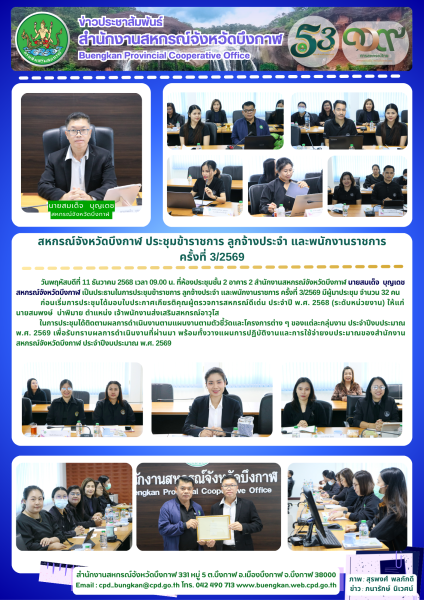 สหกรณ์จังหวัดบึงกาฬ เป็นประธานการประชุมข้าราชการ ลูกจ้างประจำ และพนักงานราชการ ครั้งที่ 3/2569 ณ ห้องประชุมชั้น 2 อาคาร 2 สำนักงานสหกรณ์จังหวัดบึงกาฬ