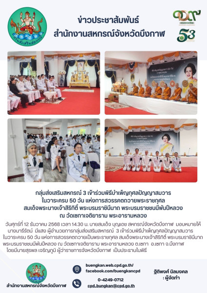 วันศุกร์ที่ 12 ธันวาคม 2568 เวลา 14.30 น. นายสมเด็จ บุญเดช สหกรณ์จังหวัดบึงกาฬ มอบหมายให้ นางนารีรัตน์ มีแสง ผู้อำนวยการกลุ่มส่งเสริมสหกรณ์ 3 เข้าร่วมพิธีบำเพ็ญกุศลปัญญาสมวาร ในวาระครบ 50 วัน แห่งการสวรรคตถวายเป็นพระราชกุศล สมเด็จพระนางเจ้าสิริกิติ์ พระบรมราชินีนาถ พระบรมราชชนนีพันปีหลวง ณ วัดเซกาเจติยาราม พระอารามหลวง ต.เซกา อ.เซกา จ.บึงกาฬ โดยมีนายสุรพล เจริญภูมิ ผู้ว่าราชการจังหวัดบึงกาฬ เป็นประธานในพิธี