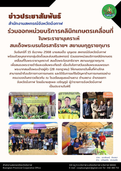 วันจันทร์ที่ 15 ธันวาคม 2568 นายสมเด็จ บุญเดช สหกรณ์จังหวัดบึงกาฬ พร้อมด้วยบุคลากรกลุ่มจัดตั้งและส่งเสริมสหกรณ์ ร่วมออกหน่วยบริการคลินิกเกษตรเคลื่อนที่ ในพระราชานุเคราห์ สมเด็จพระโอรสาธิราชฯ สยามมกุฎราชกุมาร เพื่อสนองพระราชดำริ และเฉลิมพระเกียรติ เนื่องในโอกาสวันเฉลิมพระชนมพรรษาพระบาทสมเด็จพระเจ้าอยู่หัว (28 กรกฎาคม) ให้เกษตรกรในพื้นที่ห่างไกลสามารถเข้าถึง บริการทางการเกษตร และได้รับการ แก้ไขปัญหาด้านการเกษตรอย่างครบวงจรในคราวเดียวกัน ณ โรงเรียนชุมชนบ้านซาง ตำบลซาง อำเภอเซกา จังหวัดบึงกาฬ โดยมีนายสุรพล เจริญภูมิ ผู้ว่าราชการจังหวัดบึงกาฬ เป็นประธานในพิธี