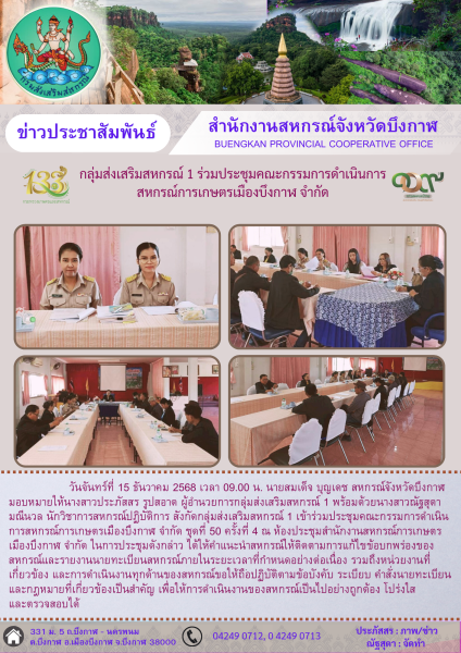 วันจันทร์ที่ 15 ธันวาคม 2568 เวลา 09.00 น. นายสมเด็จ บุญเดช สหกรณ์จังหวัดบึงกาฬ มอบหมายให้นางสาวประภัสสร รูปสอาด ผู้อำนวยการกลุ่มส่งเสริมสหกรณ์ 1 พร้อมด้วยนางสาวณัฐสุดา มณีนวล นักวิชาการสหกรณ์ปฏิบัติการ สังกัดกลุ่มส่งเสริมสหกรณ์ 1 เข้าร่วมประชุมคณะกรรมการดำเนินการสหกรณ์การเกษตรเมืองบึงกาฬ จำกัด ชุดที่ 50 ครั้งที่ 4 ณ ห้องประชุมสำนักงานสหกรณ์การเกษตรเมืองบึงกาฬ จำกัด