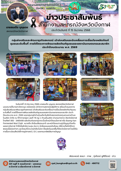 วันจันทร์ที่ 15 ธันวาคม 2568 นายสมเด็จ บุญเดช สหกรณ์จังหวัดบึงกาฬ มอบหมายให้นางสาวจิตรานุช เหมืองหม้อ นักวิชาการสหกรณ์ปฏิบัติการ พร้อมด้วยบุคลากรกลุ่มส่งเสริมและพัฒนาธูรกิจสหกรณ์ เข้าส่งเสริมและขับเคลื่อนการเชื่อมโยงผลิตภัณฑ์ชุมชนระดับพื้นที่ ภายใต้โครงการพัฒนาผลิตภัณฑ์ชุมชนของสถาบันเกษตรกรและสมาชิก ประจำปีงบประมาณ พ.ศ. 2569 ของกลุ่มทอผ้าบ้านโนนศิลาในสังกัดสหกรณ์กองทุนสวนยางตำบลโนนศิลา จำกัด ณ ที่ทำการกลุ่มฯ เลขที่ 78 หมู่ 1 ตำบลโนนศิลา อำเภอปากคาด จังหวัดบึงกาฬ โทรศัพท์ 083 - 3485408 ผลิตภัณฑ์ของกลุ่มฯจะเป็น ผ้าหมักโคลนบึงกาฬ หรือ Bueng Kan Fermented Mud Cloth หมายถึง ผ้าย้อมสีธรรมชาติ และหมักโคลนตามภูมิปัญญาท้องถิ่นของชาวบึงกาฬ ทำให้เนื้อผ้ามีความนุ่ม มันวาว มีกลิ่นหอมของดินโคลน มีสีตามที่สกัดได้จากพรรณไม้ชนิดต่างๆ และโคลนที่นำมาหมักสีจะไม่ตก ซึ่งผลิตในเขตพื้นที่จังหวัดบึงกาฬ โดยได้รับการขึ้นทะเบียนสิ่งบ่งชี้ทางภูมิศาสตร์ ( GI ) ของกรมทรัพย์สินทางปัญญา