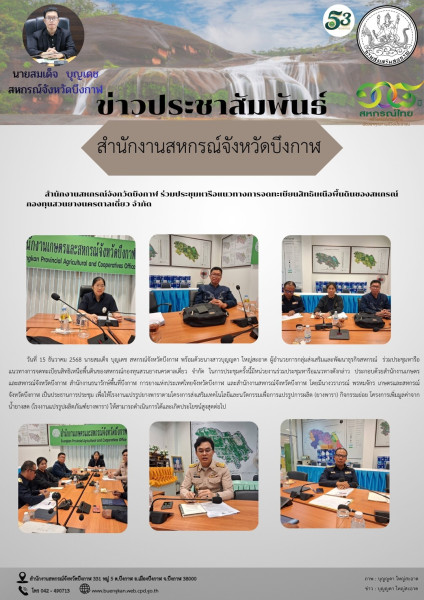 วันที่ 15 ธันวาคม 2568 นายสมเด็จ บุญเดช สหกรณ์จังหวัดบึงกาฬ พร้อมด้วยนางสาวบุญญดา ใหญ่สะอาด ผู้อำนวยการกลุ่มส่งเสริมและพัฒนาธุรกิจสหกรณ์ ร่วมประชุมหารือแนวทางการจดทะเบียนสิทธิเหนือพื้นดินของสหกรณ์กองทุนสวนยางนครตาลเดี่ยว จำกัด ในการประชุมครั้งนี้มีหน่วยงานร่วมประชุมหารือแนวทางดังกล่าว ประกอบด้วยสำนักงานเกษตรและสหกรณ์จังหวัดบึงกาฬ สำนักงานธนารักษ์พื้นที่บึงกาฬ การยางแห่งประเทศไทยจังหวัดบึงกาฬ และสำนักงานสหกรณ์จังหวัดบึงกาฬ โดยมีนางวราภรณ์ พรหมจักร เกษตรและสหกรณ์จังหวัดบึงกาฬ เป็นประธานการประชุม เพื่อให้โรงงานแปรรูปยางพาราตามโครงการส่งเสริมเทคโนโลยีและนวัตกรรมเพื่อการแปรรูปการผลิต (ยางพารา) กิจกรรมย่อย โครงการเพิ่มมูลค่าจากน้ำยางสด (โรงงานแปรรูปผลิตภัณฑ์ยางพารา) ให้สามารถดำเนินการได้และเกิดประโยชน์สูงสุดต่อไป