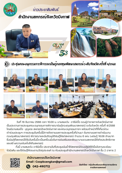 วันที่ 16 ธันวาคม 2568 เวลา 10.00 น. นายสมหวัง อารีย์เอื้อ รองผู้ว่าราชการจังหวัดบึงกาฬ เป็นประธานการประชุมคณะอนุกรรมการพิจารณาเงินกู้กองทุนพัฒนาสหกรณ์ ระดับจังหวัด ครั้งที่ 4/2568 โดยมีนายสมเด็จ บุญเดช สหกรณ์จังหวัดบึงกาฬ และคณะอนุกรรมการฯ พร้อมเจ้าหน้าที่ที่เกี่ยวข้อง เข้าร่วมประชุมฯ การประชุมในครั้งนี้มีการติดตามผลการประชุมครั้งที่ผ่านมา รับทราบผลการดำเนินงานกองทุนพัฒนาสหกรณ์ พิจารณาและมีมติอนุมัติเงินกู้ให้แก่สหกรณ์ จำนวน 6 แห่ง วงเงินกู้ 16.08 ล้านบาท ซึ่งเงินกู้ที่สหกรณ์ได้รับในครั้งนี้จะเป็นเครื่องมือในการส่งเสริมและพัฒนางานของสหกรณ์ให้เกิดประสิทธิภาพ และสร้างความเข้มแข็งให้กับสหกรณ์