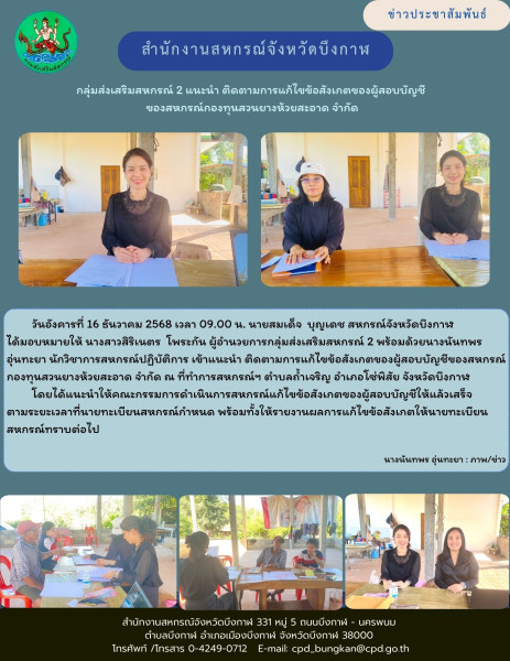วันอังคารที่ 16 ธันวาคม 2568 เวลา 09.00 น. นายสมเด็จ บุญเดช สหกรณ์จังหวัดบึงกาฬ ได้มอบหมายให้ นางสาวสิริเนตร โพระกัน ผู้อำนวยการกลุ่มส่งเสริมสหกรณ์ 2 พร้อมด้วยนางนันทพร อุ่นทะยา นักวิชาการสหกรณ์ปฏิบัติการ เข้าแนะนำ ติดตามการแก้ไขข้อสังเกตของผู้สอบบัญชีของสหกรณ์กองทุนสวนยางห้วยสะอาด จำกัด ณ ที่ทำการสหกรณ์ฯ ตำบลถ้ำเจริญ อำเภอโซ่พิสัย จังหวัดบึงกาฬ โดยได้แนะนำให้คณะกรรมการดำเนินการสหกรณ์แก้ไขข้อสังเกตของผู้สอบบัญชีให้แล้วเสร็จ ตามระยะเวลาที่นายทะเบียนสหกรณ์กำหนด พร้อมทั้งให้รายงานผลการแก้ไขข้อสังเกตให้นายทะเบียนสหกรณ์ทราบต่อไป