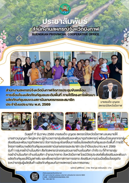 วันพุธที่ 17 ธันวาคม 2568 นายสมเด็จ บุญเดช สหกรณ์จังหวัดบึงกาฬ มอบหมายให้ นางสาวบุญญดา ใหญ่สะอาด ผู้อำนวยการกลุ่มส่งเสริมและพัฒนาธุรกิจสหกรณ์ พร้อมด้วยบุคลากรกลุ่มส่งเสริมและพัฒนาธุรกิจสหกรณ์ จัดการประชุมขับเคลื่อนการเชื่อมโยงผลิตภัณฑ์ชุมชนระดับพื้นที่ ภายใต้โครงการพัฒนาผลิตภัณฑ์ชุมชนของสถาบันเกษตรกรและสมาชิก ประจำปีงบประมาณ พ.ศ. 2569 รุ่นที่ 1 กลุ่มทอผ้าบ้านโนนศิลา สังกัดสหกรณ์กองทุนสวนยางตำบลโนนศิลา จำกัด ณ ที่ทำการกลุ่มทอผ้าบ้านโนนศิลา ตำบลโนนศิลา อำเภอปากคาด จังหวัดบึงกาฬ โดยมีวัตถุประสงค์เพื่อส่งเสริมและพัฒนาผลิตภัณฑ์ชุมชนให้มีมูลค่าเพิ่ม และเพื่อขยายโอกาสทางการตลาด ส่งเสริมความร่วมมือเชื่อมโยงธุรกิจระหว่างกลุ่มผู้ผลิตสินค้า ผลิตภัณฑ์ชุมชนกับภาคสหกรณ์ และภาคเอกชน