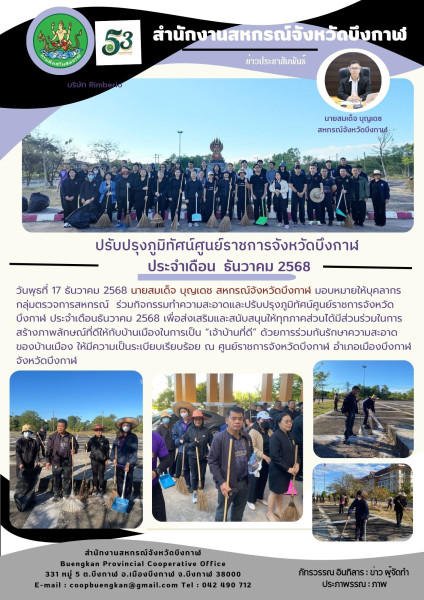 วันพุธที่ 17 ธันวาคม 2568 นายสมเด็จ บุญเดช สหกรณ์จังหวัดบึงกาฬ มอบหมายให้บุคลากรกลุ่มตรวจการสหกรณ์ ร่วมกิจกรรมทำความสะอาดและปรับปรุงภูมิทัศน์ศูนย์ราชการจังหวัดบึงกาฬ ประจำเดือนธันวาคม 2568 เพื่อส่งเสริมและสนับสนุนให้ทุกภาคส่วนได้มีส่วนร่วมในการสร้างภาพลักษณ์ที่ดีให้กับบ้านเมืองในการเป็น “เจ้าบ้านที่ดี” ด้วยการร่วมกันรักษาความสะอาดของบ้านเมือง ให้มีความเป็นระเบียบเรียบร้อย ณ ศูนย์ราชการจังหวัดบึงกาฬ อำเภอเมืองบึงกาฬ จังหวัดบึงกาฬ