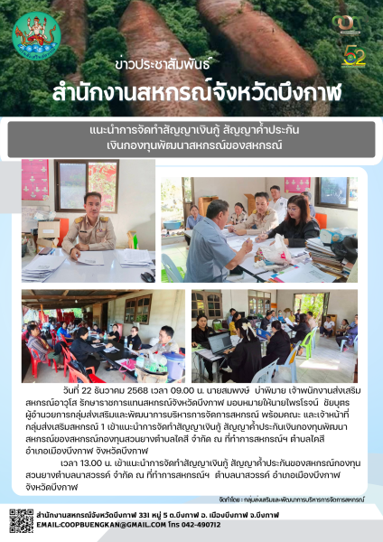 วันที่ 22 ธันวาคม 2568 เวลา 09.00 น. นายสมพงษ์ บ่าพิมาย เจ้าพนักงานส่งเสริมสหกรณ์อาวุโส รักษาราชการแทนสหกรณ์จังหวัดบึงกาฬ มอบหมายให้นายไพรโรจน์ ชัยบุตร ผู้อำนวยการกลุ่มส่งเสริมและพัฒนาการบริหารการจัดการสหกรณ์ พร้อมคณะ และเจ้าหน้าที่กลุ่มส่งเสริมสหกรณ์ 1 เข้าแนะนำการจัดทำสัญญาเงินกู้ สัญญาค้ำประกันเงินกองทุนพัฒนาสหกรณ์ของสหกรณ์กองทุนสวนยางตำบลไคสี จำกัด ณ ที่ทำการสหกรณ์ฯ ตำบลไคสี อำเภอเมืองบึงกาฬ จังหวัดบึงกาฬ
