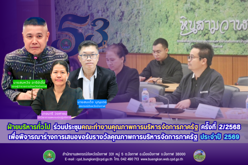 ในการประชุมคณะทำงานได้พิจารณาร่างการเสนอขอรับรางวัลคุณภาพการบริหารจัดการภาครัฐ ประจำปี 2569 ซึ่งจังหวัดบึงกาฬโดยคณะทำงานได้ลงมติเห็นชอบเสนอขอรีบรางวัลฯ ประเภทคุณภาพการบริหารจัดการภาครัฐ รายหมวด 3 หมวด ประกอบด้วย หมวด 1 ด้านการนำองค์กรและความรับผิดชอบต่อสังคม หมวด 2 ด้านการวางแผนยุทธศาสตร์และการสื่อสารเพื่อนำไปสู่การปฏิบัติ และ หมวด 3 ด้านการมุ่งเน้นผู้รับบริการและผู้มีส่วนได้ส่วนเสีย