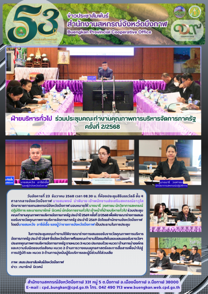 วันอังคารที่ 23 ธันวาคม 2568 เวลา 08.30 น. ที่ห้องประชุมสิรินธรวัลลี ชั้น 4 ศาลากลางจังหวัดบึงกาฬ นายสมพงษ์ บ่าพิมาย เจ้าพนักงานส่งเสริมสหกรณ์อาวุโส รักษาราชการแทนสหกรณ์จังหวัดบึงกาฬ มอบหมายให้ นางนารี วงศาชม นักวิชาการสหกรณ์ปฏิบัติการ และนายภนารักษ์ นิเวศน์ นักจัดการงานทั่วไป ฝ่ายบริหารทั่วไป ร่วมประชุมคณะทำงานคุณภาพการบริหารจัดการภาครัฐ ประจำปี 2569 ครั้งที่ 2/2568 เพื่อพิจารณาร่างการเสนอขอรับรางวัลคุณภาพการบริหารจัดการภาครัฐ ประจำปี 2569 จัดโดยสำนักงานจังหวัดบึงกาฬ โดยมีนายสมหวัง อารีย์เอื้อ รองผู้ว่าราชการจังหวัดบึงกาฬ เป็นประธานในการประชุม