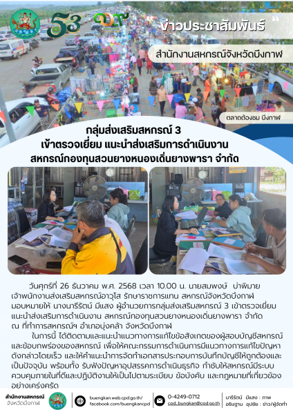 วันศุกร์ที่ 26 ธันวาคม พ.ศ. 2568 เวลา 10.00 น. นายสมพงษ์ บ่าพิมาย เจ้าพนักงานส่งเสริมสหกรณ์อาวุโส รักษาราชการแทน สหกรณ์จังหวัดบึงกาฬ มอบหมายให้ นางนารีรัตน์ มีแสง ผู้อำนวยการกลุ่มส่งเสริมสหกรณ์ 3 เข้าตรวจเยี่ยม แนะนำส่งเสริมการดำเนินงาน สหกรณ์กองทุนสวนยางหนองเดิ่นยางพารา จำกัด ณ ที่ทำการสหกรณ์ฯ อำเภอบุ่งคล้า จังหวัดบึงกาฬ