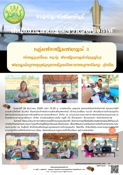 วันศุกร์ที่ 26 ธันวาคม 2568 เวลา 13.30 น. นายสมเด็จ บุญเดช สหกรณ์จังหวัดบึงกาฬ มอบหมายให้ นางสาวจีรโชติ นิเวศน์ ตำแหน่งเจ้าพนักงานส่งเสริมสหกรณ์ เข้าตรวจเยี่ยม แนะนำ ส่งเสริมการดำเนินธุรกิจ สหกรณ์กองทุนสวนยางห้วยผักขะยางทองพัฒนา จำกัด ณ ลานรวบรวมยางพาราสหกรณ์กองทุนสวนยางห้วยผักขะยางทองพัฒนา จำกัด บ้านห้วยผักขะเหนือ หมู่ที่ 22 ตำบลเซกา อำเภอเซกา จังหวัดบึงกาฬ