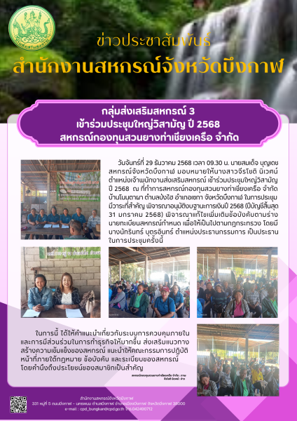 วันจันทร์ที่ 29 ธันวาคม 2568 เวลา 09.30 น. นายสมเด็จ บุญเดช สหกรณ์จังหวัดบึงกาฬ มอบหมายให้นางสาวจีรโชติ นิเวศน์ ตำแหน่งเจ้าพนักงานส่งเสริมสหกรณ์ เข้าร่วมประชุมใหญ่วิสามัญปี 2568 ณ ที่ทำการสหกรณ์กองทุนสวนยางท่าเชียงเครือ จำกัด บ้านโนนตาผา ตำบลป่งไฮ อำเภอเซกา จังหวัดบึงกาฬ ในการประชุมมีวาระที่สำคัญ พิจารณาอนุมัติงบฐานะการเงินปี 2568 (ปีบัญชีสิ้นสุด 31 มกราคม 2568) พิจารณาแก้ไขเพิ่มเติมข้อบังคับตามร่างนายทะเบียนสหกรณ์กำหนด เพื่อให้เป็นไปตามกฎกระทรวง โดยมีนางนัทรินทร์ บุตรอินทร์ ตำแหน่งประธานกรรมการ เป็นประธานในการประชุมครั้งนี้