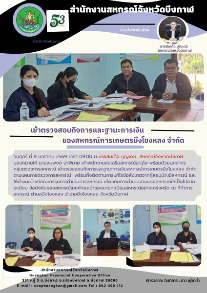 วันที่ 9 มกราคม 2569 นายสมเด็จ บุญเดช สหกรณ์จังหวัดบึงกาฬ มอบหมายให้นายสมพงษ์ บ่าพิมาย เจ้าพนักงานส่งเสริมสหกรณ์อาวุโส พร้อมด้วยบุคลากรกลุ่มตรวจการสหกรณ์ เข้าตรวจสอบกิจการและฐานะการเงินสหกรณ์การเกษตรบึงโขงหลง จำกัด ตามแผนการตรวจการสหกรณ์ พร้อมทั้งติดตามการแก้ไขข้อสังเกตจากผู้สอบบัญชีสหกรณ์ และ ให้คำแนะนำแก่คณะกรรมการดำเนินการสหกรณ์เกี่ยวกับการดำเนินงานของสหกรณ์ให้เป็นไปตามระเบียบข้อบังคับของสหกรณ์และ คำแนะนำของนายทะเบียนสหกรณ์อย่างเคร่งครัด ณ ที่ทำการสหกรณ์ ตำบลบึงโขงหลง อำเภอบึงโขงหลง จังหวัดบึงกาฬ