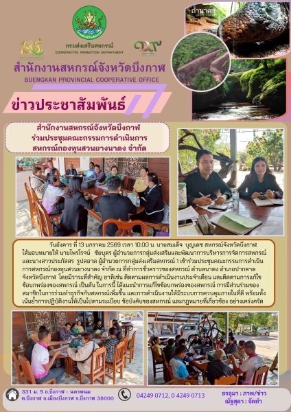 วันอังคาร ที่ 13 มกราคม 2569 เวลา 10.00 น. นายสมเด็จ บุญเดช สหกรณ์จังหวัดบึงกาฬ ได้มอบหมายให้ นายไพรโรจน์ ชัยบุตร ผู้อำนวยการกลุ่มส่งเสริมและพัฒนาการบริหารการจัดการสหกรณ์ และนางสาวประภัสสร รูปสอาด ผู้อำนวยการกลุ่มส่งเสริมสหกรณ์ 1 เข้าร่วมประชุมคณะกรรมการดำเนินการสหกรณ์กองทุนสวนยางนาดง จำกัด ณ ที่ทำการชั่วคราวของสหกรณ์ ตำบลนาดง อำเภอปากคาด จังหวัดบึงกาฬ โดยมีวาระที่สำคัญ อาทิเช่น ติดตามผลการดำเนินงานประจำเดือน และติดตามการแก้ไขข้อบกพร่องของสหกรณ์ เป็นต้น