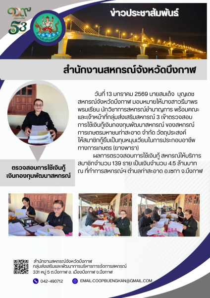 วันที่ 13 มกราคม 2569 นายสมเด็จ บุญเดช สหกรณ์จังหวัดบึงกาฬ มอบหมายให้นางสาวธีมาพร พรมเรียน นักวิชาการสหกรณ์ชำนาญการ พร้อมคณะ และเจ้าหน้าที่กลุ่มส่งเสริมสหกรณ์ 3 เข้าตรวจสอบการใช้เงินกู้เงินกองทุนพัฒนาสหกรณ์ ของสหกรณ์การเกษตรมหาชนท่าสะอาด จำกัด วัตถุประสงค์ให้สมาชิกกู้ยืมเป็นทุนหมุนเวียนในการประกอบอาชีพทางการเกษตร (ยางพารา)