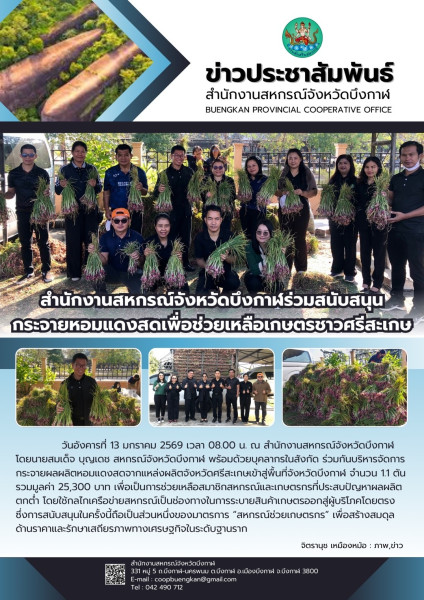 วันอังคารที่ 13 มกราคม 2569 เวลา 08.00 น. ณ สำนักงานสหกรณ์จังหวัดบึงกาฬ โดยนายสมเด็จ บุญเดช สหกรณ์จังหวัดบึงกาฬ พร้อมด้วยบุคลากรในสังกัด ร่วมกันบริหารจัดการกระจายผลผลิตหอมแดงสดจากแหล่งผลิตจังหวัดศรีสะเกษเข้าสู่พื้นที่จังหวัดบึงกาฬ จำนวน 1.1 ตัน รวมมูลค่า 25,300 บาท เพื่อเป็นการช่วยเหลือสมาชิกสหกรณ์และเกษตรกรที่ประสบปัญหาผลผลิตตกต่ำ โดยใช้กลไกเครือข่ายสหกรณ์เป็นช่องทางในการระบายสินค้าเกษตรออกสู่ผู้บริโภคโดยตรง ซึ่งการสนับสนุนในครั้งนี้ถือเป็นส่วนหนึ่งของมาตรการ “สหกรณ์ช่วยเกษตรกร” เพื่อสร้างสมดุล